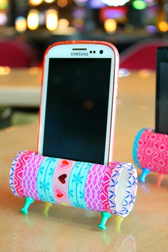 这样一个可爱的手机架,几个图钉与卷纸筒就可以做到。