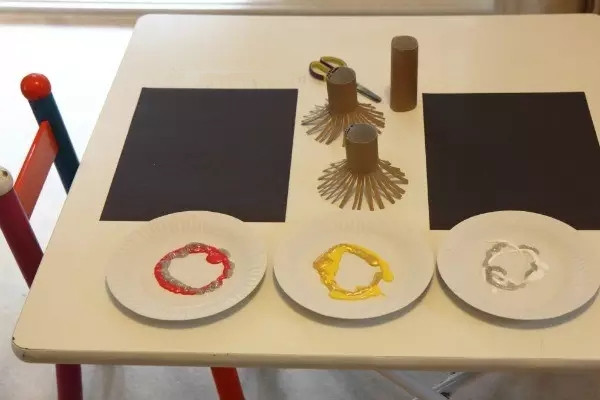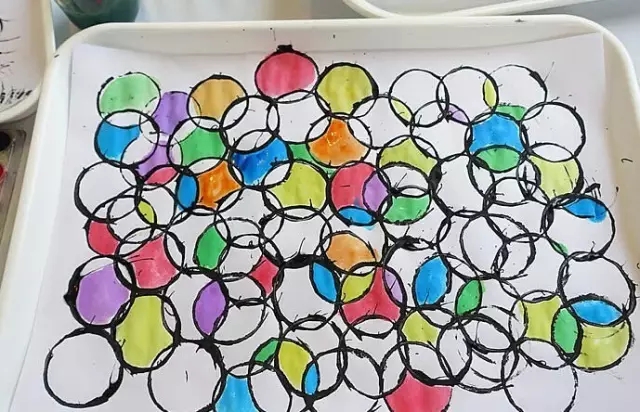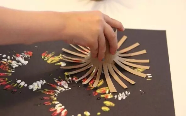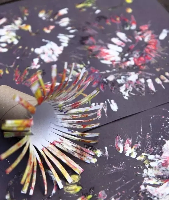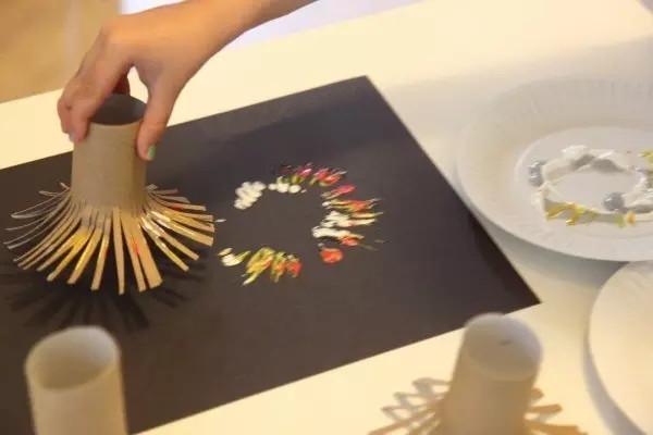 将卷纸筒剪成一条条的,具体的宽度看个人喜好即可;直接蘸取颜料在黑色的纸张上作画。