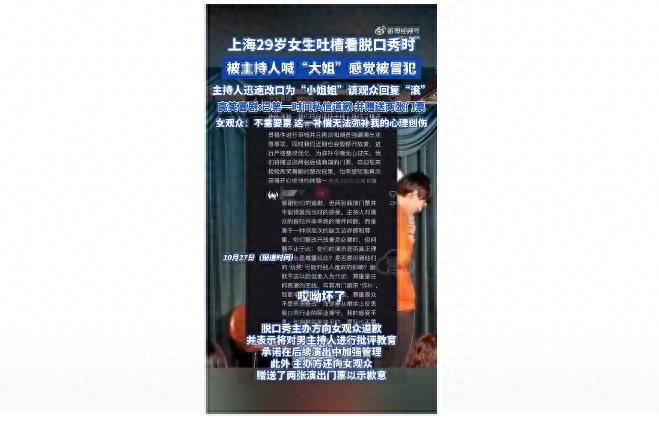 10月27日,上海——在一场普通的脱口秀演出中,一位29岁的女性观众因对主持人的称呼感到不满,引发了一场不小的风波。