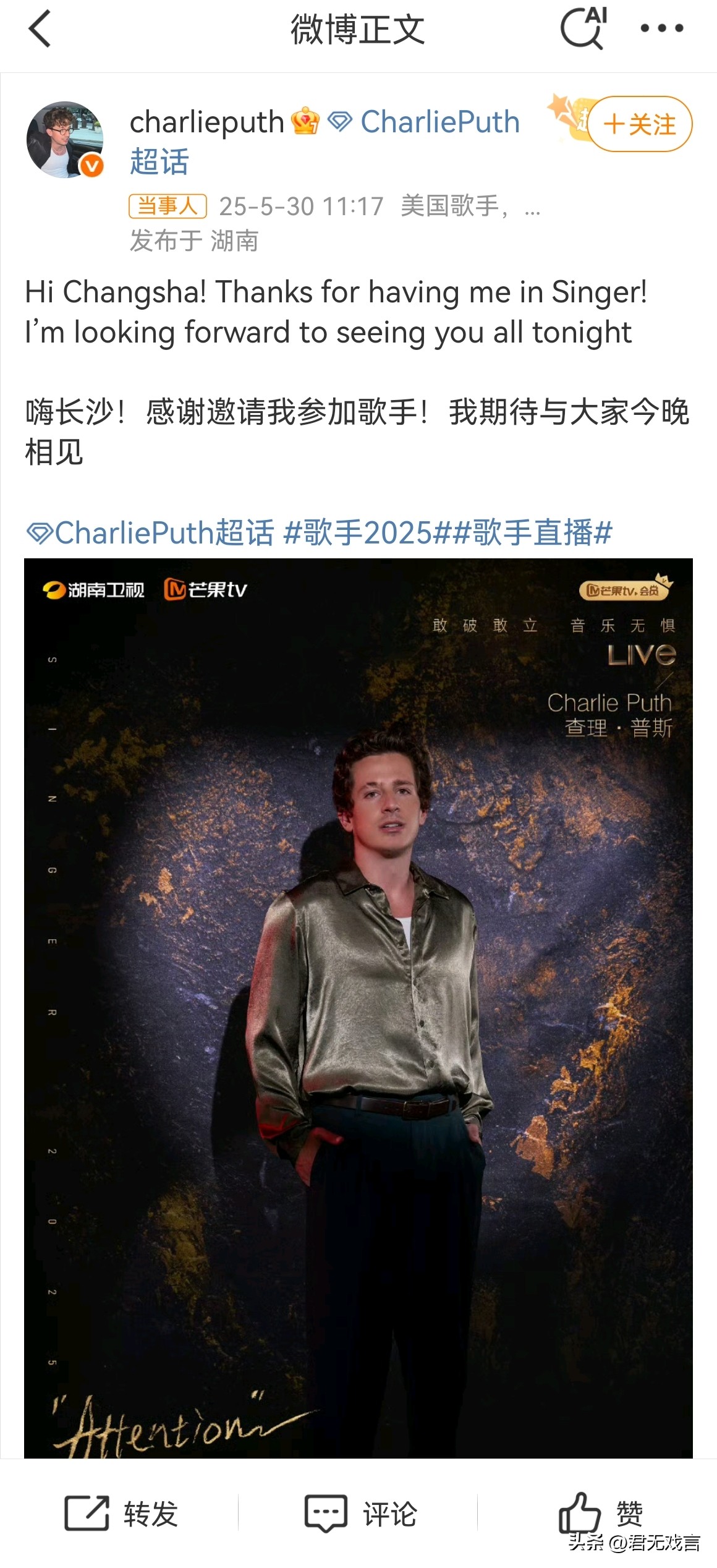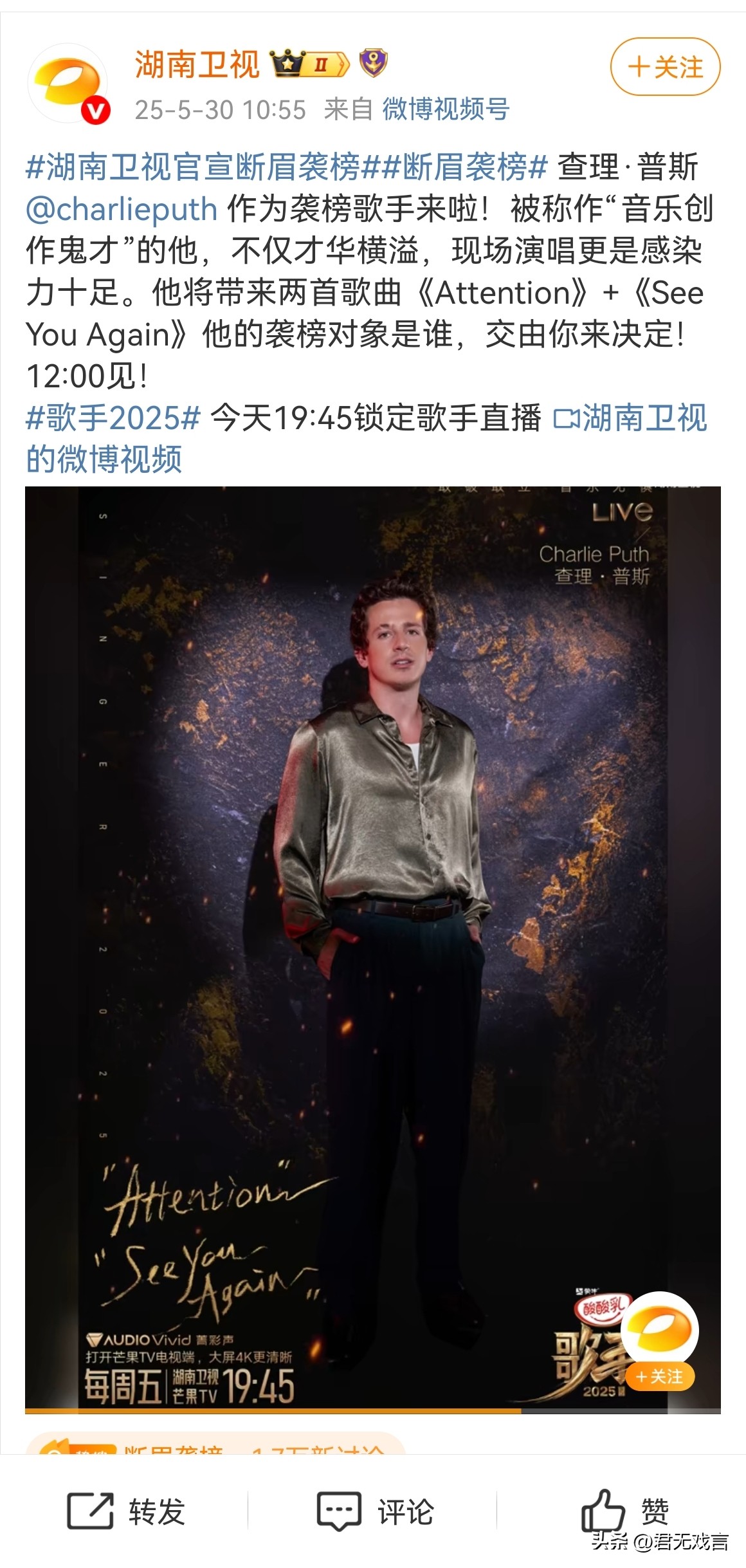 断眉查理·普斯的IP地址显示湖南,这不正是《歌手2025》第三期录制地吗?紧接着节目组内部消息流出:他将以“袭榜歌手”身份空降5月30日直播现场,演唱经典曲目《See You Again》或《We Don't Talk Anymore》。这消息瞬间点燃全网,这位欧美乐坛才子的袭榜对象到底是谁?