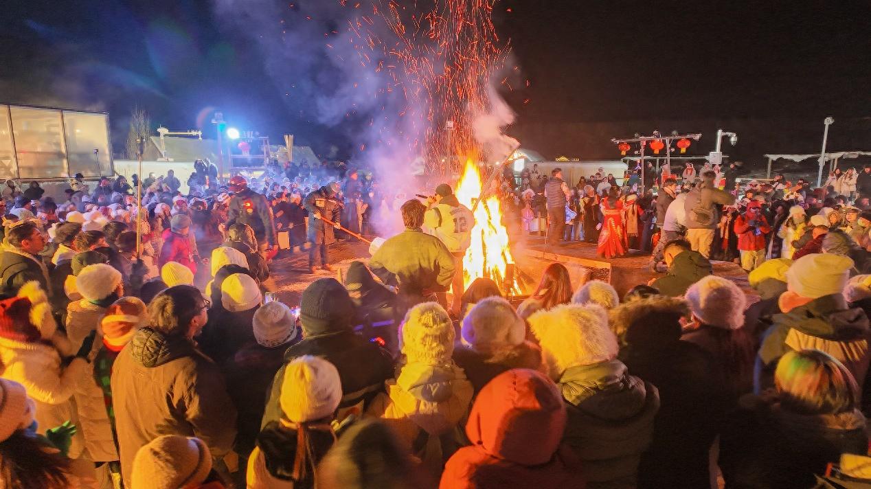 国际在线报道(记者 张一林): 随着日落西山,被皑皑白雪覆盖的恬静雪村——禾木,也渐渐从淡紫色的维纳斯带中浸入了夜晚。然而,禾木村的烟火气并没有随黑夜消散,在村中央步行街的尽头,一场篝火晚会点燃了人们的激情,也让禾木村的夜晚笼罩在烟火气中。