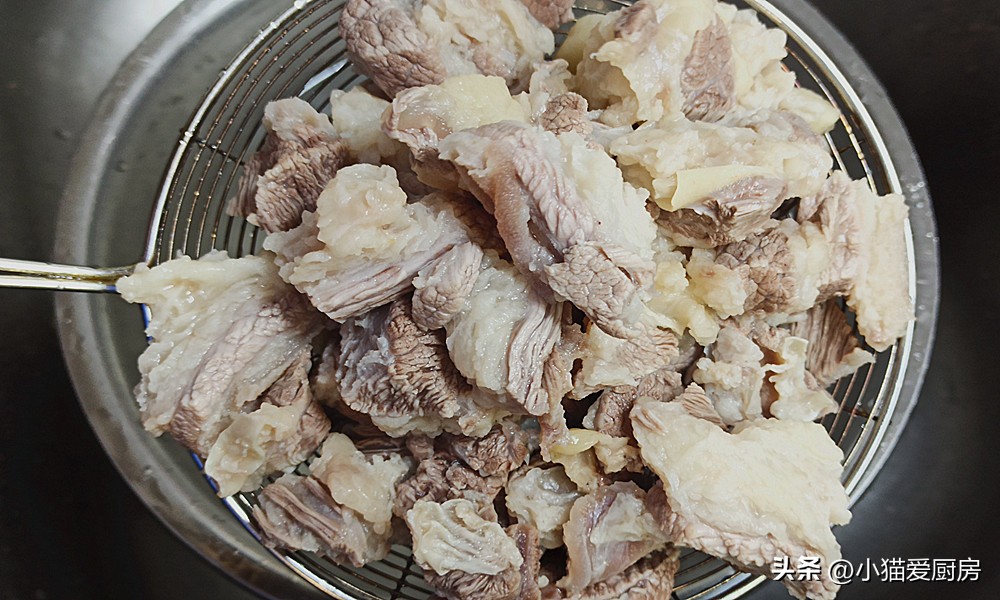 5、牛腩焯完水捞出来,用热水冲洗几遍,把浮沫和杂质清洗干净,然后控干水分备用。