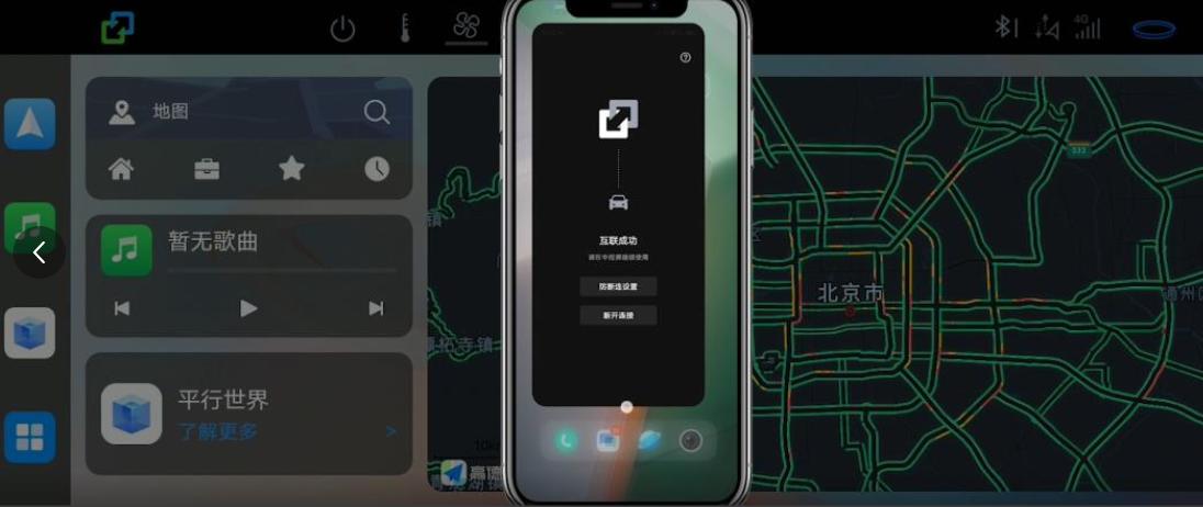 平行世界功能介绍:支持把手机上的部分应用投射到车机屏幕上,车机在不安装应用的前提下使用这部分应用,实现车机生态的多元化,丰富化(仅安卓鸿蒙高配手机支持)。