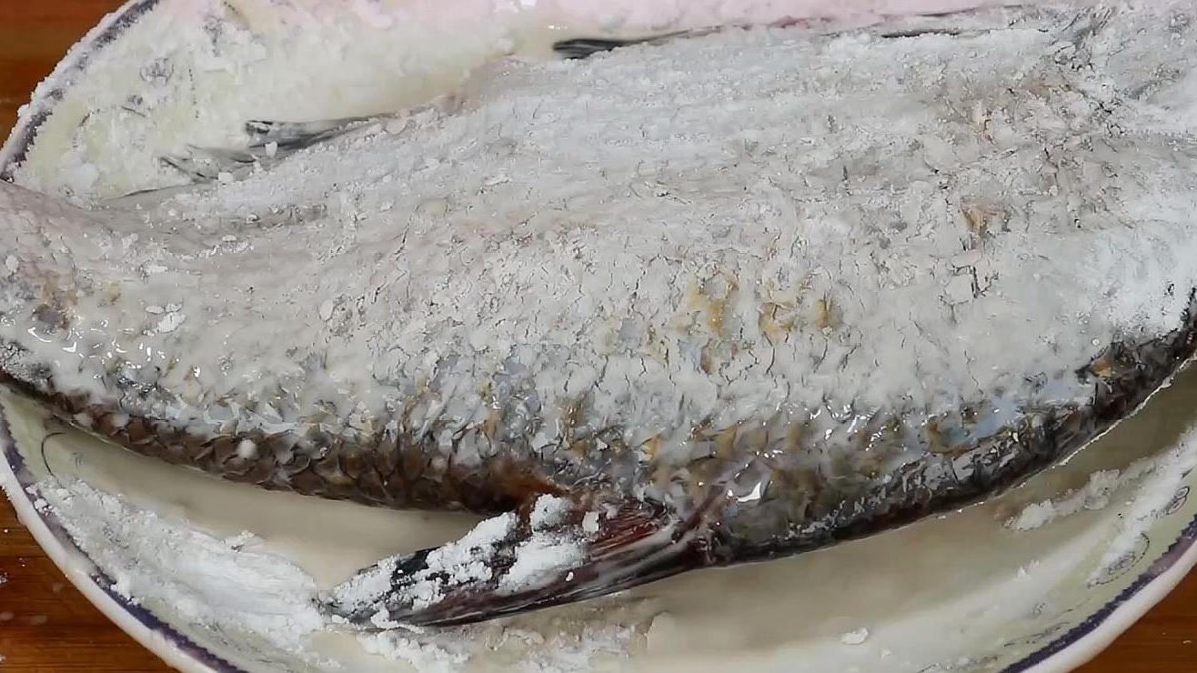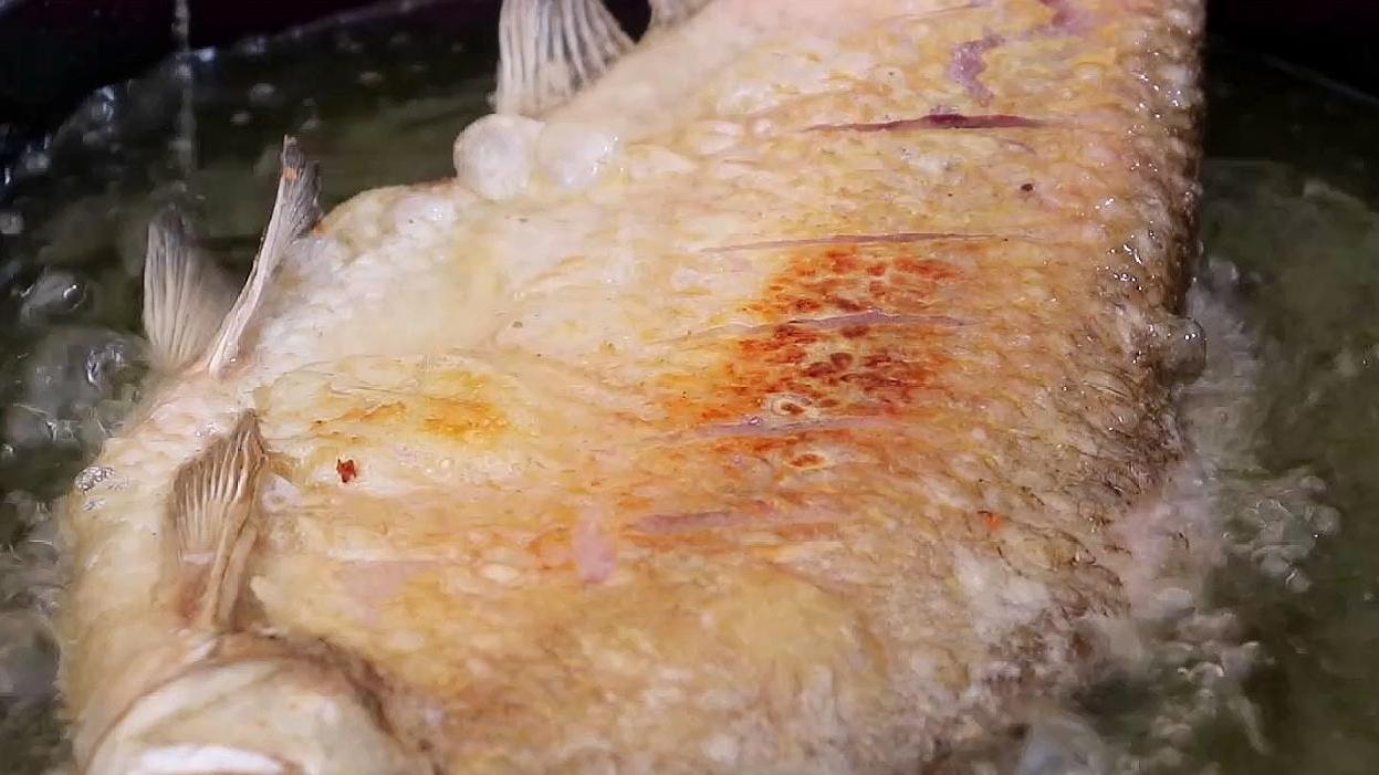 5、起锅烧油,油要多倒一点,然后咱们把腌好的鳊鱼放进去炸一下在炸的过程中,如果油没法没过鳊鱼的话,那么就需要用一个勺子将热油淋在鱼的另一面。等到鳊鱼底面炸至焦黄之后,咱们翻一下面继续炸,两面炸至焦黄后关火出锅。