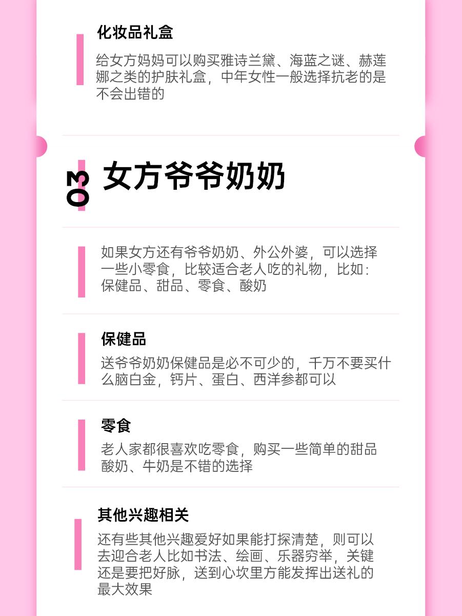 当然具体的礼物价格也要考虑自己和女方家的家庭情况、生活习惯等,不仅要给她的爸爸妈妈带,如果当天还有别的亲戚在,也要给他们准备哦!