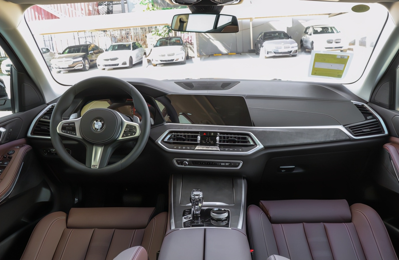 这台宝马X5中控台整体设计更加简洁,采用了大量金属饰条和木纹饰板装饰,点睛之笔是用了水晶的换挡杆,十分精致。更少的按钮以及横向设计的中控台也符合当下时代趋势,车内大量使用皮质材料和哑光铝质感的按钮,看上去档次感十足。