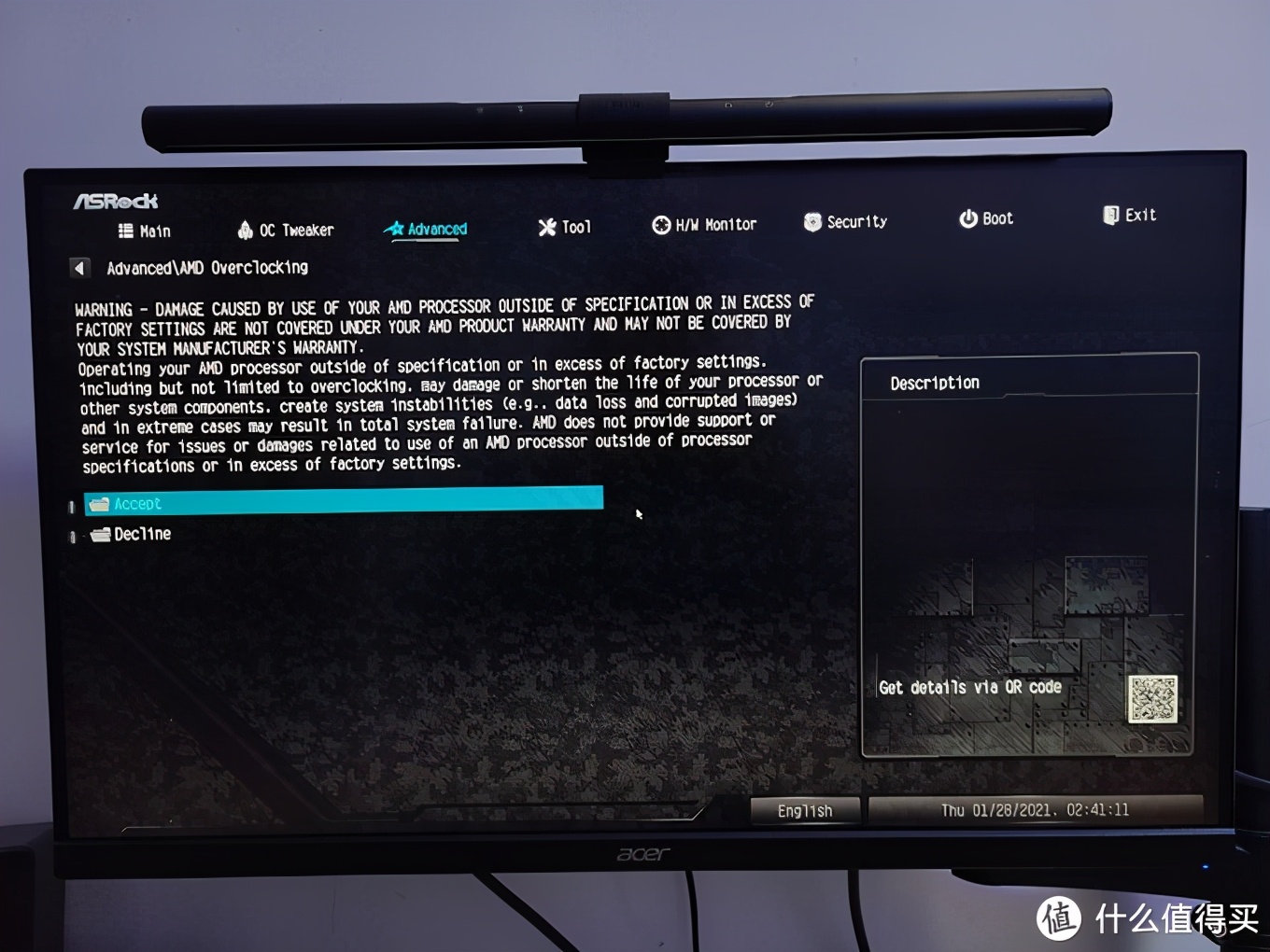 这里会跳出一个风险提示,不用管它,直接点accept接受。然后就可以看到Presision boost overdirve(PBO)设定了。