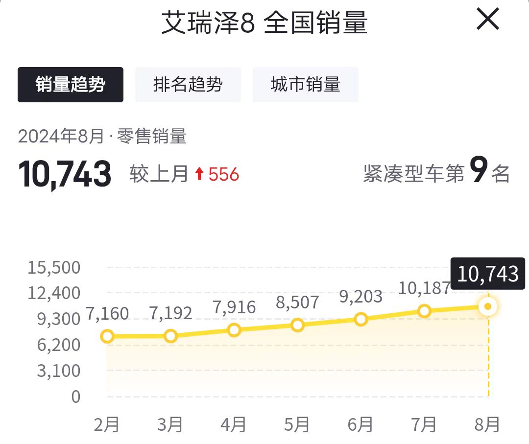 以1.6T智为例,优惠2万元之后的落地价在11.8万左右,和合资A级车相比,拥有更大的车身尺寸、更有质感的内饰、更丰富的配置以及更强的动力。从销量来看,艾瑞泽8在7月和8月的销量均超过万台,算得上相当可观。