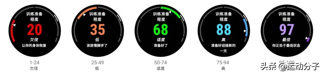 综合性的指标,会根据一周的睡眠、HRV心率变异状态、压力及训练负荷等数据,判断当天是否适合高强度训练。训练准备程度主要分为欠佳、低、适度、高、最佳五种。