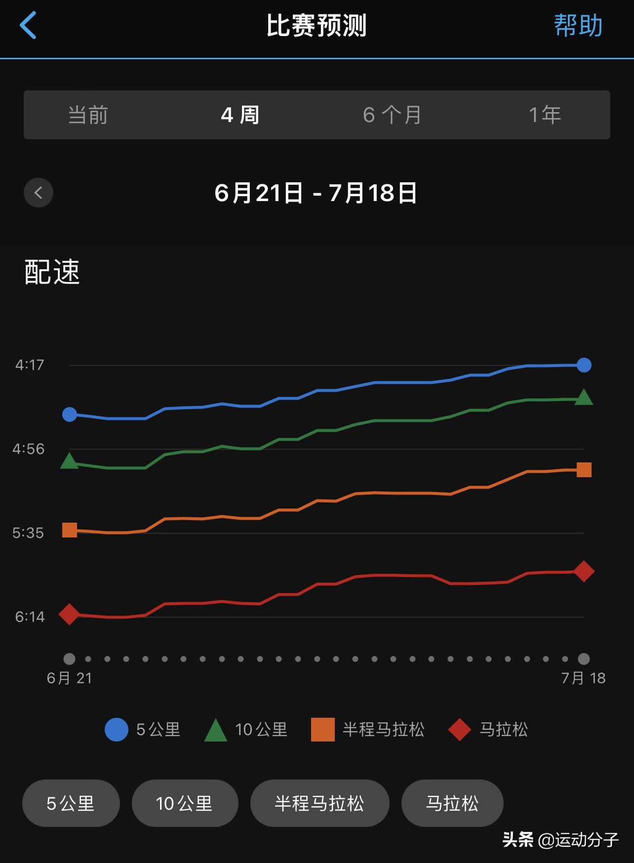 (全马水准在345左右的女测评者,近三个月疫情封禁后恢复训练,可以看到比赛预测成绩在不断提升/恢复中。)