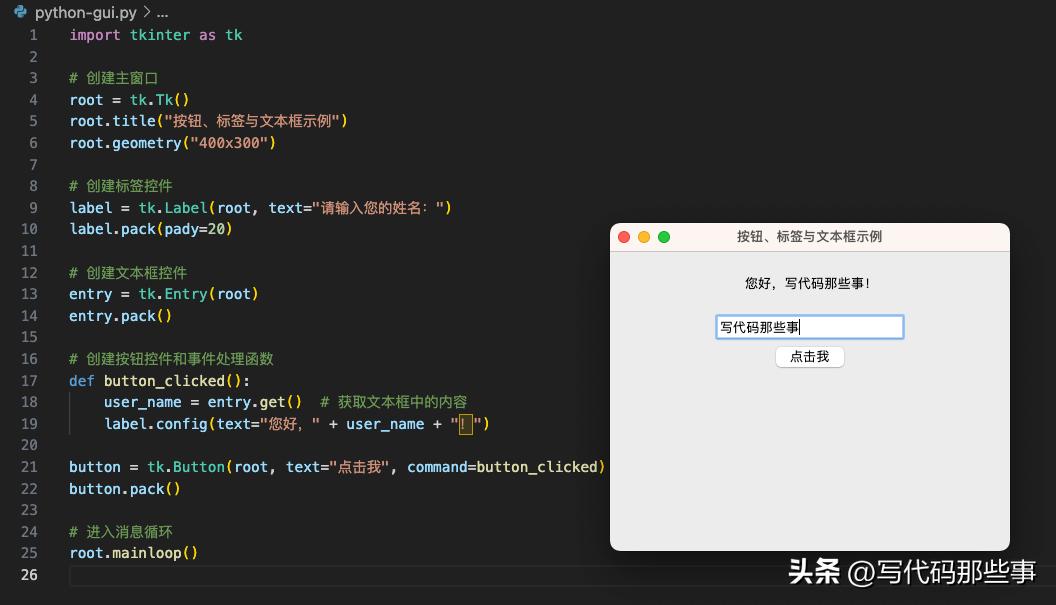 - 使用tk.Entry()创建一个文本框控件,用户可以在其中输入文本。