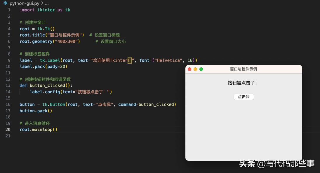 - 定义了一个回调函数button_clicked(),当按钮被点击时会执行这个函数。在这个函数中,我们通过label.config()修改标签的文本。