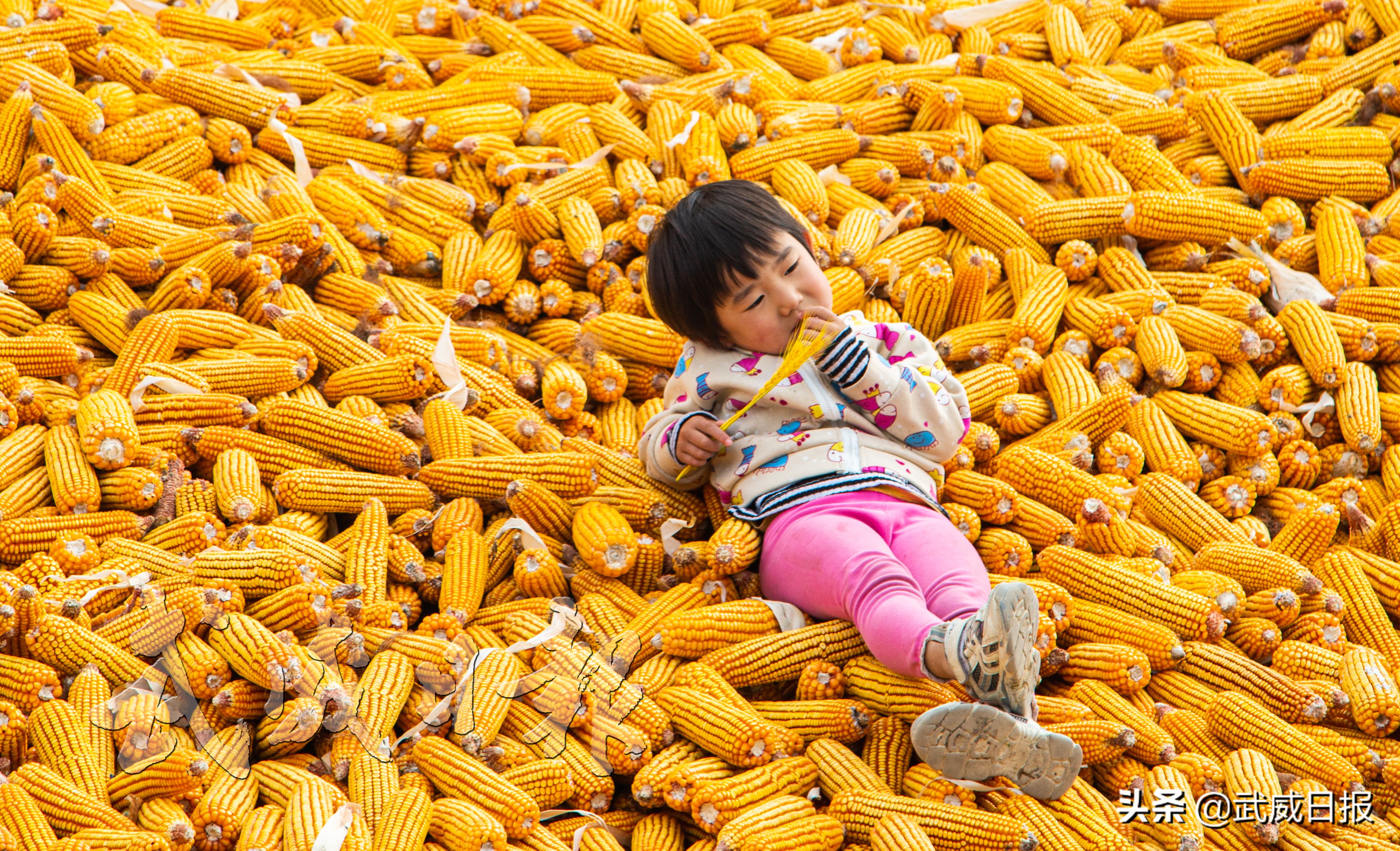 10月4日,凉州区清水镇张清村,小女孩悠闲地躺在家门前的玉米堆上。近年来,清水镇坚持高格局提升产业发展新层级,初步形成了以“菜苗花菌牛羊猪鸡”和乡村旅游为主的九大富民产业,农民人均可支配收入达到16021元。