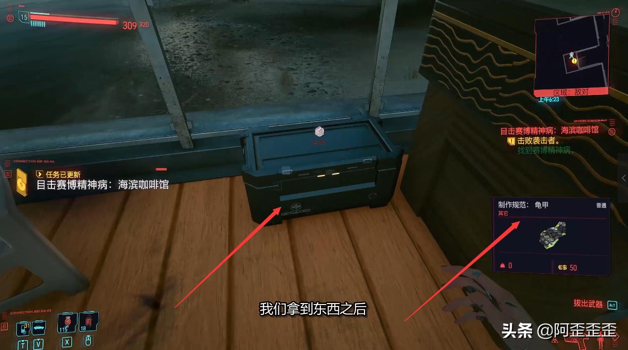 我们拿到东西之后,旁边的赛博精神病已经冲到上面去杀人了,我们不管他从旁边翻下去,直接溜走。