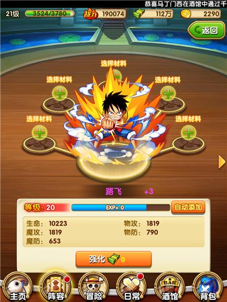 航海王强者之路中基础界面上没有直接升级的按钮,需要我们点击其中的英雄,就是点路飞就能进入到路飞的属性界面了。
