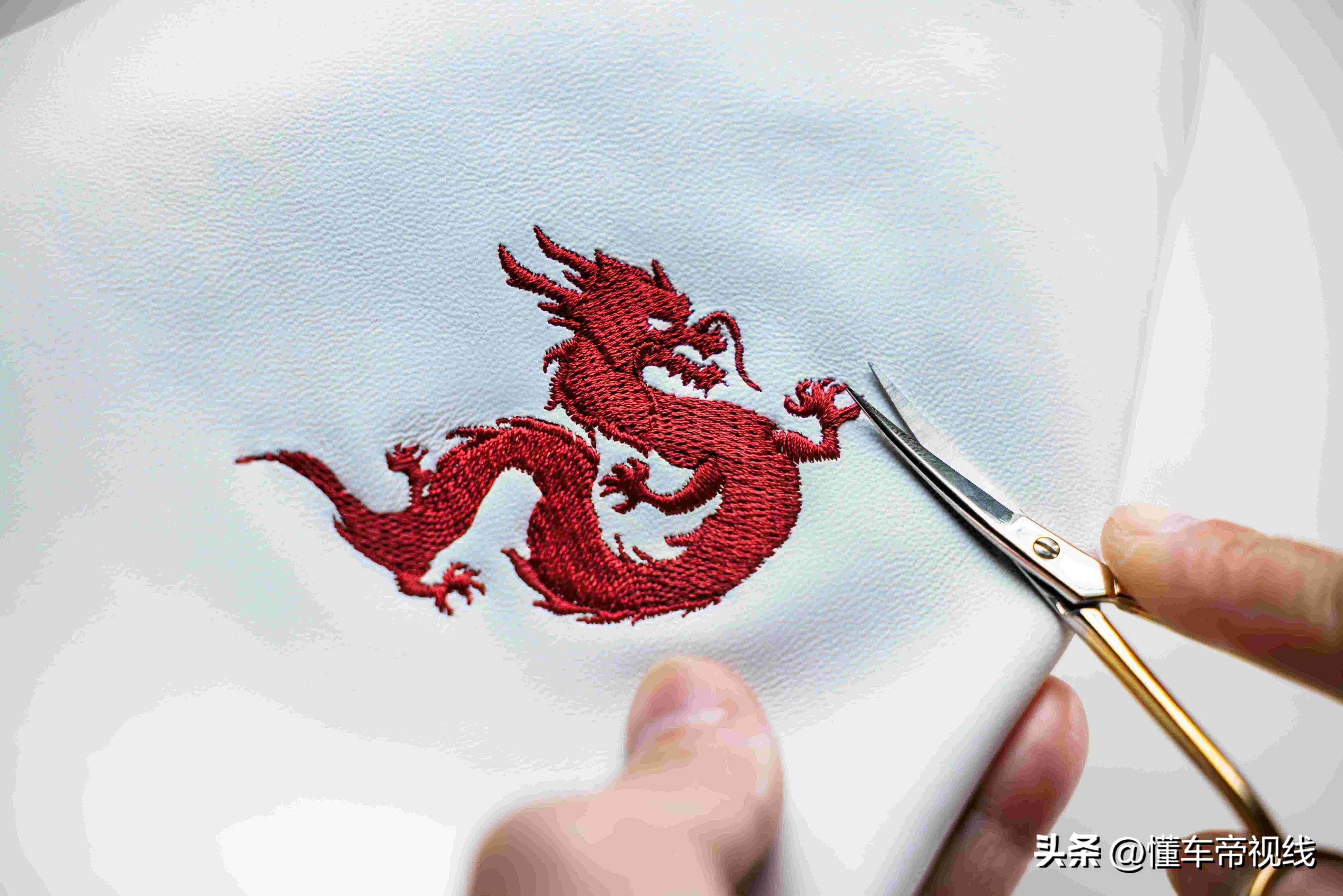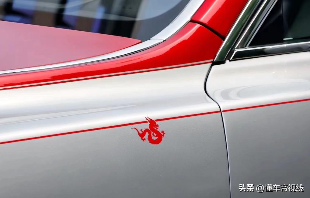 基于实车图片来看,该车采用了塞尔比灰色涂装,发动机舱罩、车顶和尾厢盖等位置采用了樱桃红色点缀,同时还配备有“镜面”轮辋。手工绘制的腰线采用了凤凰红配色,并且融入龙元素,每条龙均面朝右侧。