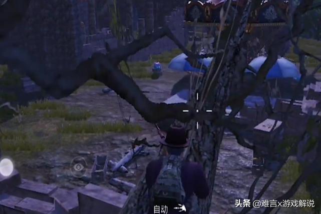 第二个:旋转木马左侧的树上。第二个位置就是旋转木马左侧的树上,玩家在落地简单搜集物资,有枪之后,就可以来到左侧的围墙处,利用攀爬动作上去,然后面向树木,连续跳跃触发攀爬动作就能上到树木上面,在这上面可以清楚观察到敌人的动向,不过这儿并不是很安全,因为没树叶当掩体,所以比较容易被敌人发现。