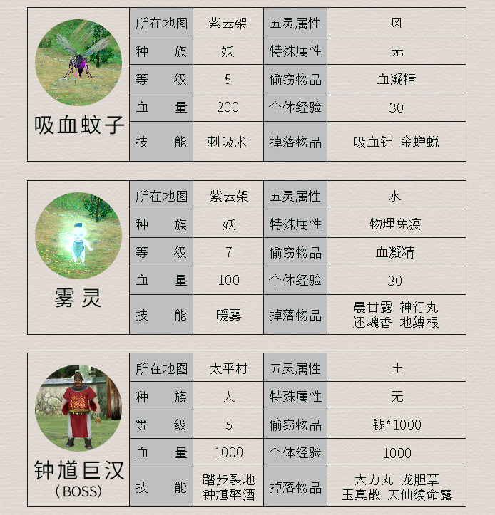 第一章“初涉尘世”,战斗场景地图有紫云架(顶部和底部)、太平村、湖边树林、柳府、八公山、女萝岩、淮南王陵、碗丘山、千佛塔,期间出现的各种怪物及其各项属性如下: