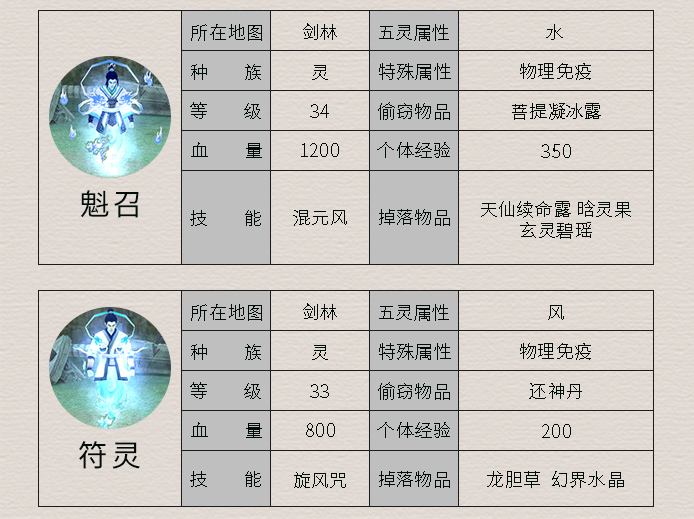 第二章“寻仙昆仑”,战斗场景地图有太一仙径(紫薇道/白灏道/寂玄道)、须臾幻境(酒、财)。月牙河谷、剑林、醉花荫、狐仙居、神农洞(烈焰洞和炙炎洞)、百翎洲,怪物图鉴如下: