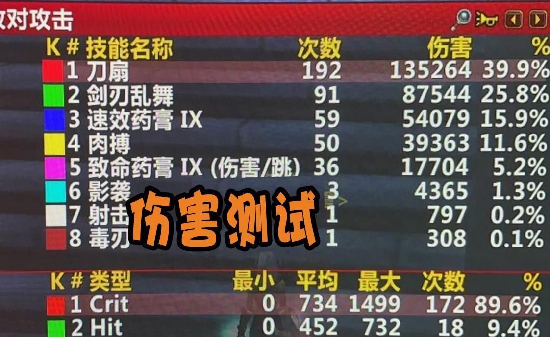 针对这个发现,有盗贼玩家还专门进行了伤害测试,并且得出结论,在超过8个敌对单位的战斗里,佩戴泰坦神铁法术之刃的盗贼打出的刀扇伤害,甚至要比25人老克掉落的226拳套还要高,这还的得利于泰坦法术之刃属于匕首武器,刀扇有111%的伤害加成,反观226等级的拳套武器虽然武器伤害高,但是刀扇技能只享受非匕首武器75%左右的伤害。