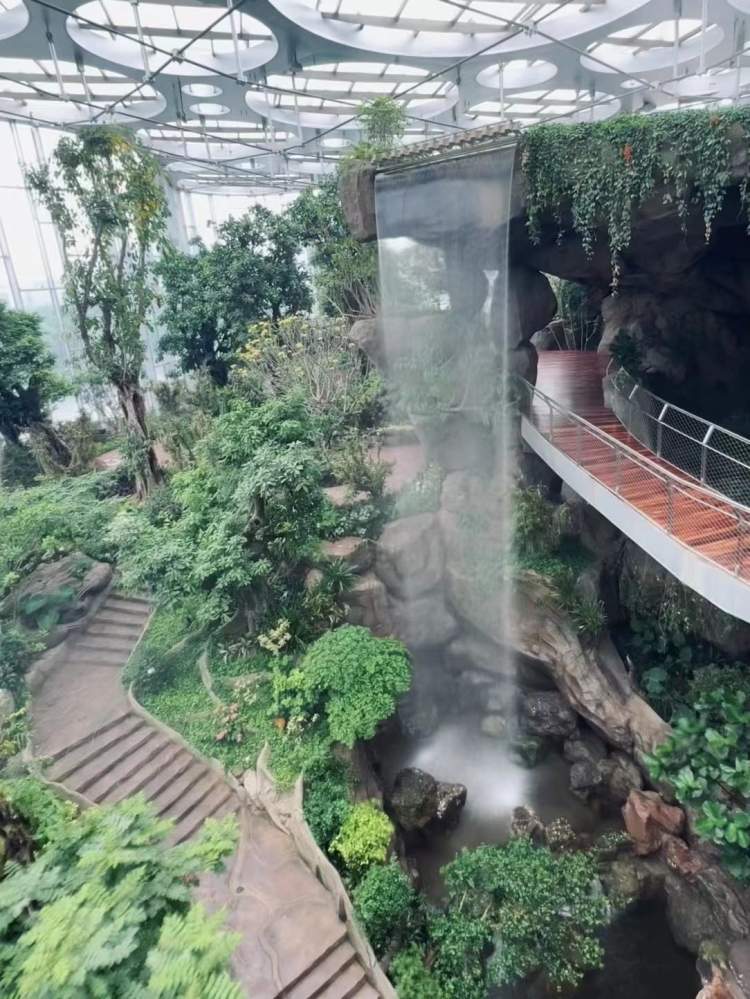 园方介绍,上海温室花园的三大主题场馆根据植物的生境进行分类设置,结合建筑的空间结构,选取世界生态系统中的典型生态片段,打造了热带干旱、热带湿生耐荫、热带湿生喜阳三种环境类型,分别展示热带干旱植物、热带雨林植物与热带花卉植物。展示形式上力求表现从植物到博物+文化的延展,打造好看、好玩的沉浸式展览温室。主题场馆内有瀑布,还有光影效果展示,给游客一个全新的观赏体验。