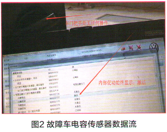 故障诊断:接车时,与车主沟通时得知:不久前,因怀疑遥控器电池申量不足而更换了遥控器电池,但故障依旧。维修人员现场验证故障现象时,该车故障未再现。使用遥控钥匙锁止车门后,携带遥控器在车门外部天线可识别位置,手握门把手准备开启车门时,车门可以自动开启,按压车门把手位置的锁止电容传感器时,车门也可以正常锁止。使用诊断仪检测车辆各系统,未发现任何故障信息。只好将车辆交给车主,并建议车主在使用过程中,留意故障出现规律,以及故障出现时是否还有其他异常,如:故障出现前是否有高频率地触摸车门把手、故障出现时拉车门把手钥匙上的指示灯是否点亮、故障出现与停车时长之间的关系等。