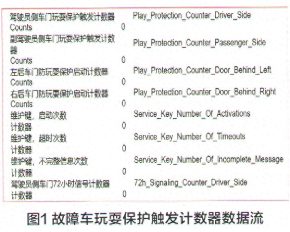 乘客侧车门玩耍保护触发计数器均为0,说明无钥匙进入防玩耍功能并未激活(图1)。 经过多次测试发现,故障出现时驾驶侧车门通过无钥匙进入系统无法打开,但乘客侧车门可以通过无钥匙进入系统打开。