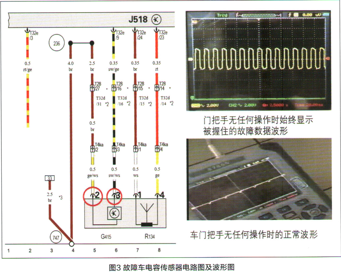 连接专用诊断仪,读取系统数据流发现,在故障出现时左前门把手无任何操作的情况下,“内侧促动”始终显示“激活”(图2),此时无钥匙进入操作无任何反应,需要按压遥控钥匙才可以打开车门。检查车门把手外观,未包裹其他饰件、未进行过喷漆处理。传感器在没有促发的情况下自己发送信号的可能性比较低,但为了慎重起见,我们还是利用示波器来检测车门把手上电容传感器的波形。通过波形检测发现,故障出现时的波形与数据流中的结果一致(图3),因此可以确定天线发送了错误信号。车主携带钥匙进入可识别的范围内时,车门把手电容传感器始终提供给控制单元处于被握住状态的信号,J518为避免误开车门而未让车门天线来促发钥匙信号,导致无钥匙功能进入失效。更换新的车门把手后交车,在使用一段时间后进行电话回访,车主反映该车故障已被彻底排除。