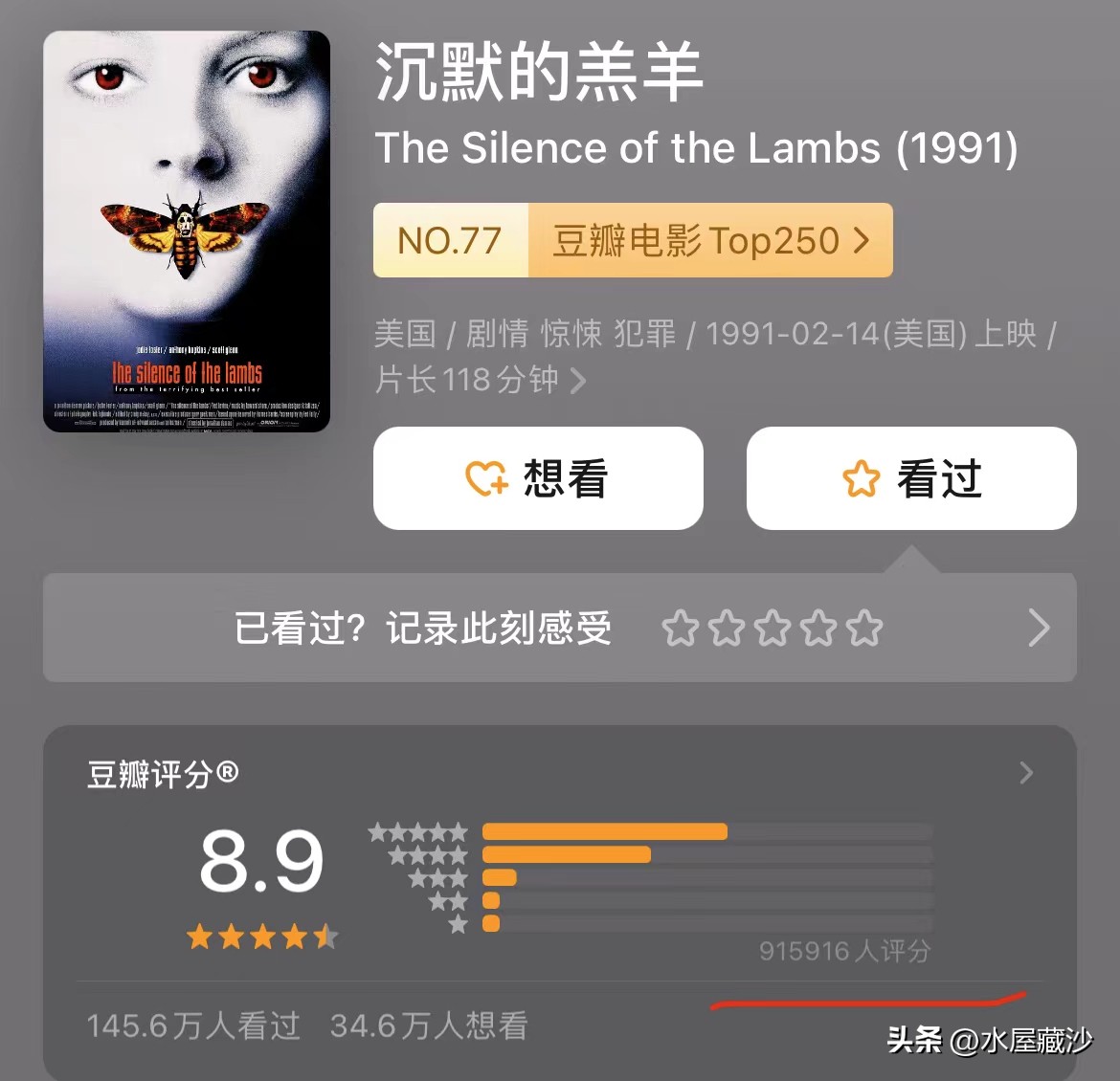 《沉默的羔羊》在豆瓣上超过91万人评分,获得8.9的高分。145.6万人看过。而这仅是豆瓣的数据。