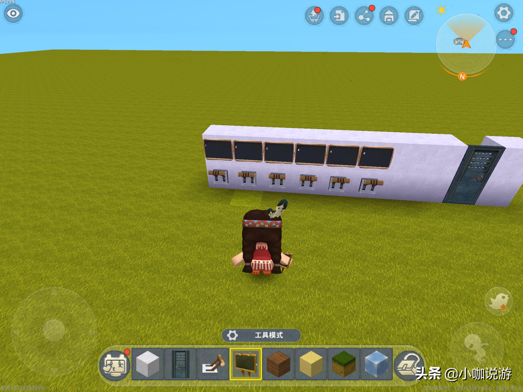 随后,玩家要在墙壁的最下方格子处分别装上开关,每个开关上方分别放下一块黑板,上面写下各自开关对应的密码数字。如果玩家觉得密码锁建得简单,也可以额外再添加多一些数字,或用字母来代替。但在这里为了方便演示,我就拿“123456”来举例。