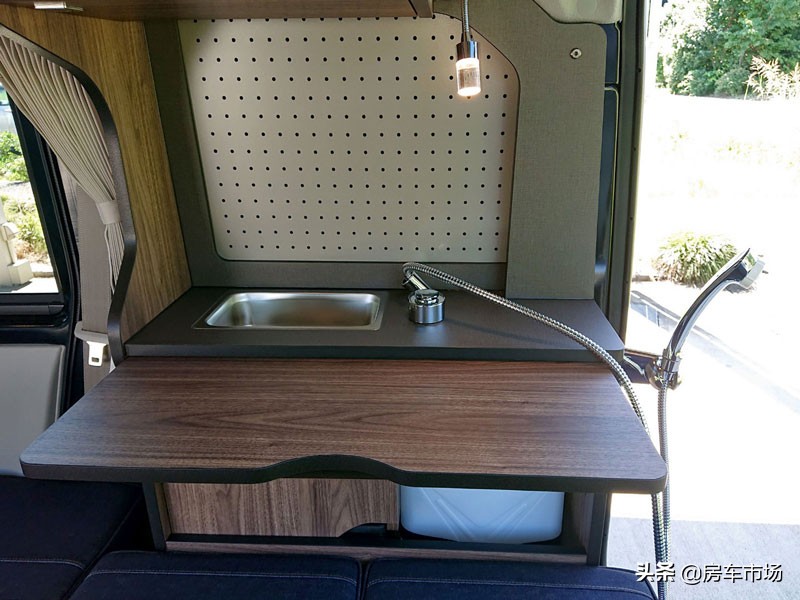 右侧的橱柜设置了不锈钢水槽,旁边是带有延长水管的伸缩水龙头,也可以当做淋浴喷头,车内车外都可以使用,下部是一个10升的清水箱、10升灰水箱。橱柜尺寸不大,下面设置了一个翻折板,增加柜台面积。床下设置较大的储物空间,内部放置了一块85Ah电池。