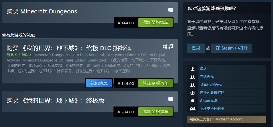 《我的世界:地下城》标准版售价144元;《我的世界:地下城》终极DLC捆绑包售价144元,包含6个付费DLC,不含主体;《我的世界:地下城》终极版售价284元,包含游戏主体,6个付费DLC以及原声带和数字艺术作品。
