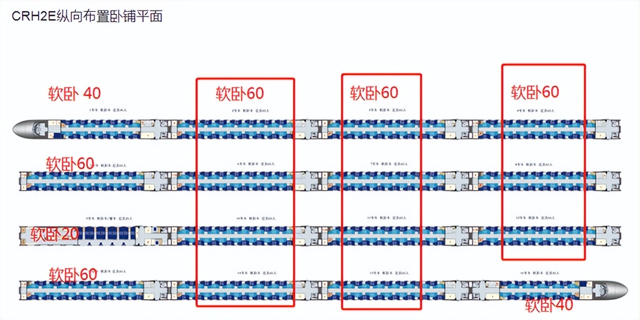 - CHRH2E系列动车车厢,是全软卧车厢,除了1和16号定员40人,9车定员20人加餐车,其余车厢定员60人,属于加长型的;