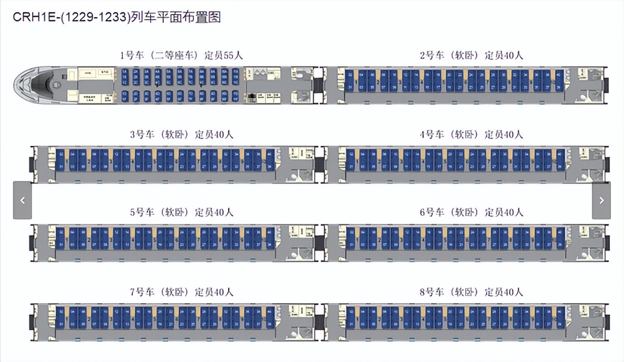 - CHRH1E(1229-1233)列车略有不同,1和16号车厢的定员是55人,其余车厢内的布局与上面基本一致。