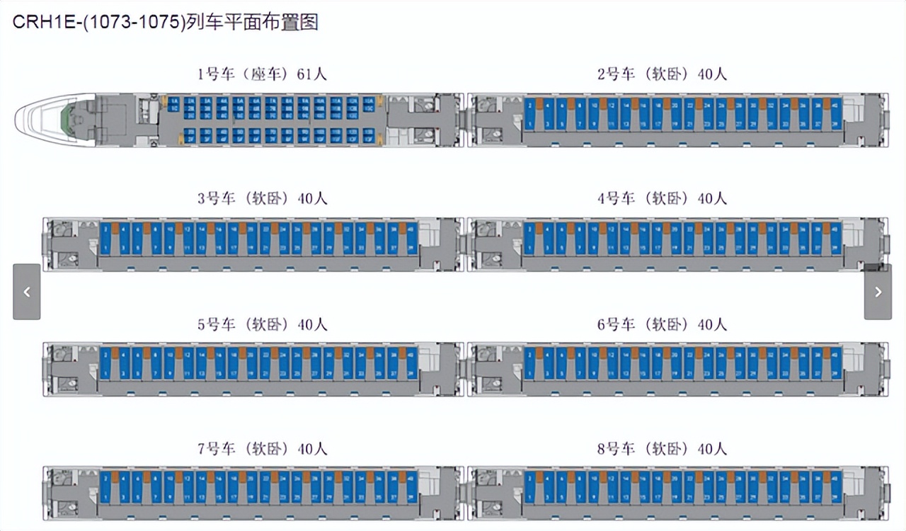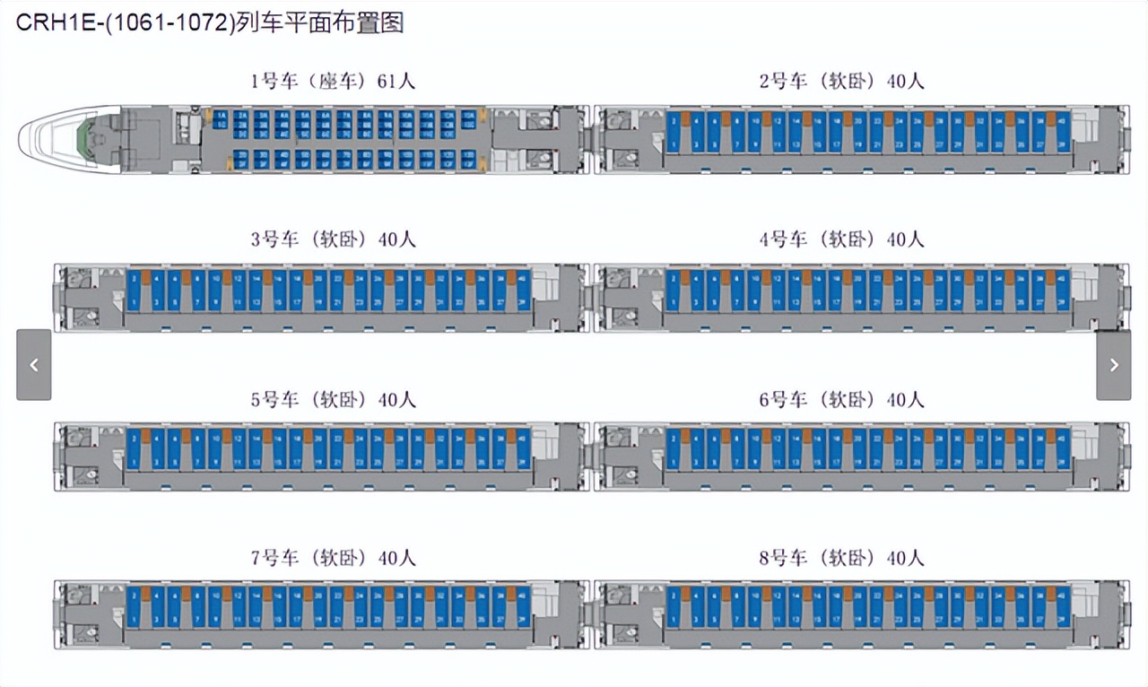 - CHRH1E(1061-1072)列车和CHRH1E(1073-1075)列车除了1和16号车厢是二等座,定员是61人,9号车厢是餐车,还有定员12的软卧,其余车厢都是定员40人的软卧,分布方式也是4名乘客一个独立包厢,共10个包厢;