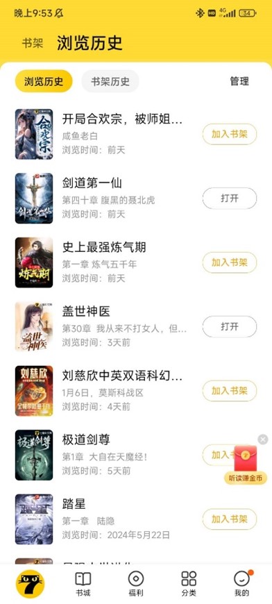 (3)在浏览记录方面,番茄有“今天”和“更早”两个标签,但是七猫没有。(如下图)