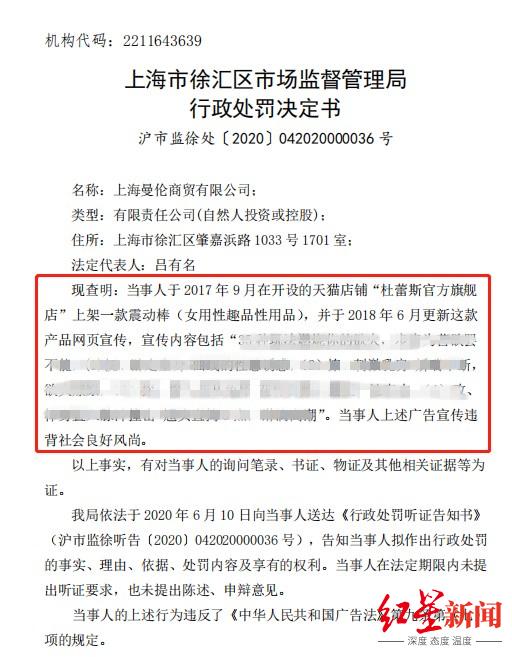 记者查询国家企业信用信息公示系统出示的行政处罚决定书,决定书显示当事人于2017年9月在开设的天猫店铺“杜蕾斯官方旗舰店”上架一款女性用品,并于2018年6月更新这款产品网页宣传,违反《中华人民共和国广告法》第九条,以及《中华人民共和国广告法》第五十七条。