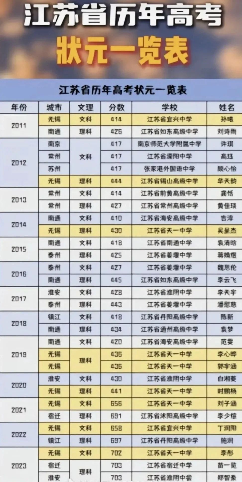 据统计,加上今年的文理状元,无锡已连续6年蝉联江苏省高考状元,宿迁中学连续两年蝉联的江苏省高考状元。