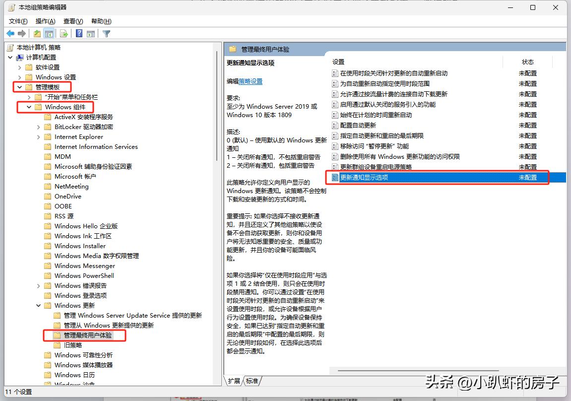 2. 在本地组策略编辑器窗口中依次展开到计算机配置 - 管理模板 - Windows 组件 - Windows 更新 - 管理最终用户体验,右侧找到更新通知显示选项