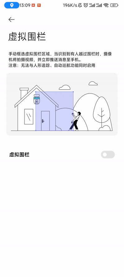 ▼虚拟围栏可以划定一个虚拟区域,当有移动目标进入该区域后,就会触发记录或警报,搭配智能联动可以实现更多功能,这是很多同级别监控所不具备的功能,非常考验监控本身的算法能力