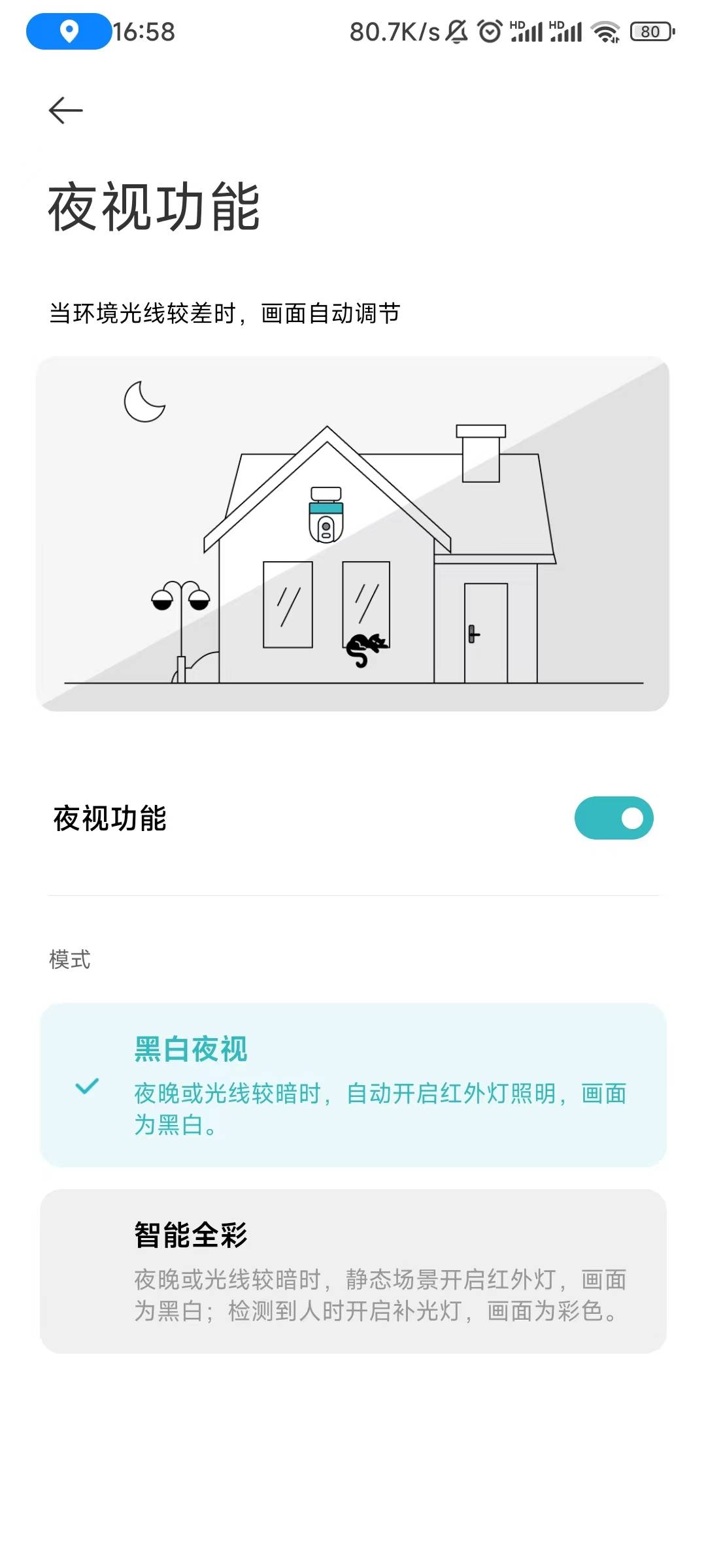 ▼然后是智能全彩,在黑白夜视的基础上,识别到人进入画面后,自动开启白光补光灯进行照明