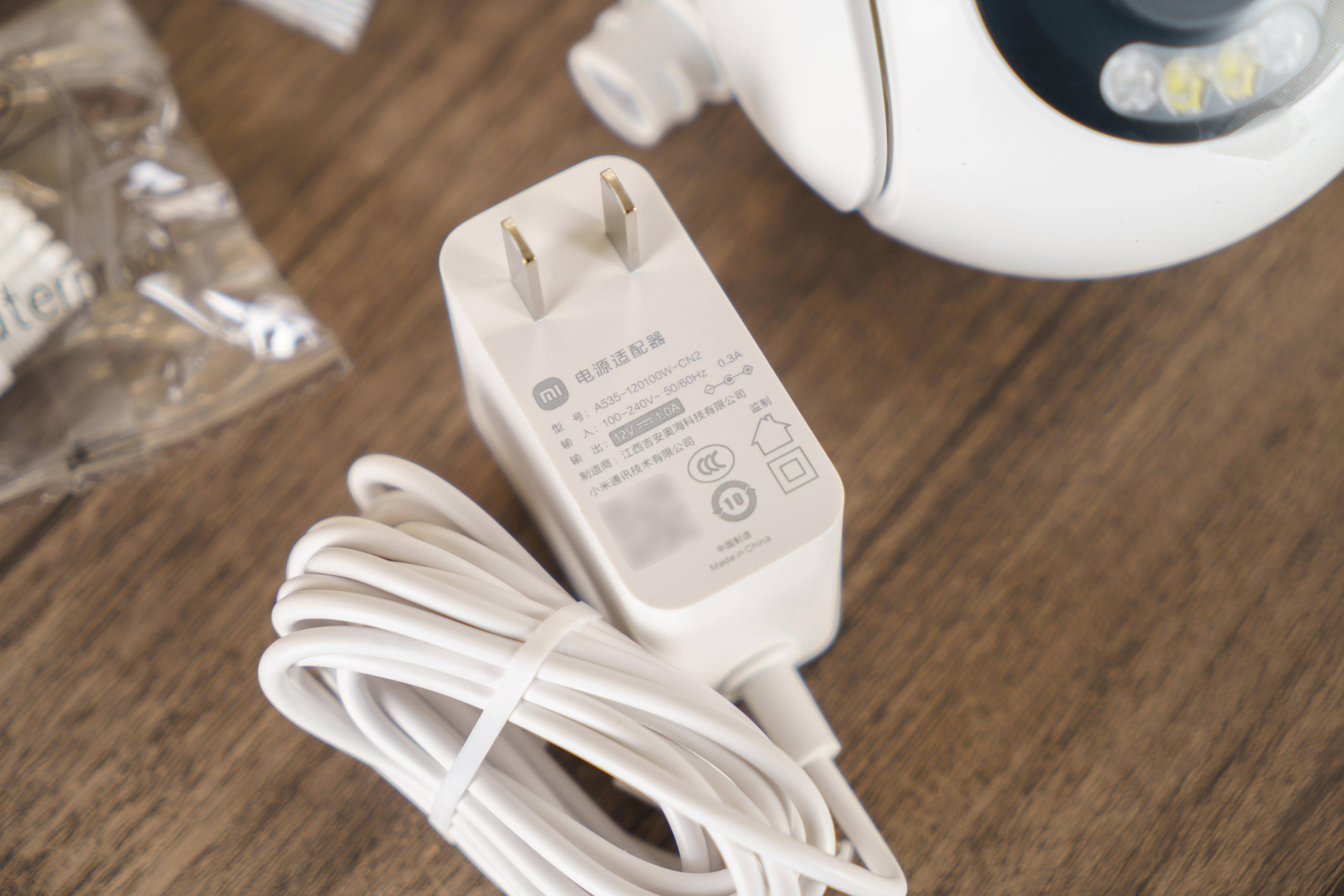 ▼电源适配器特写,输入参数为12V1A,表示这个摄像机的最大功率也不会超过12W