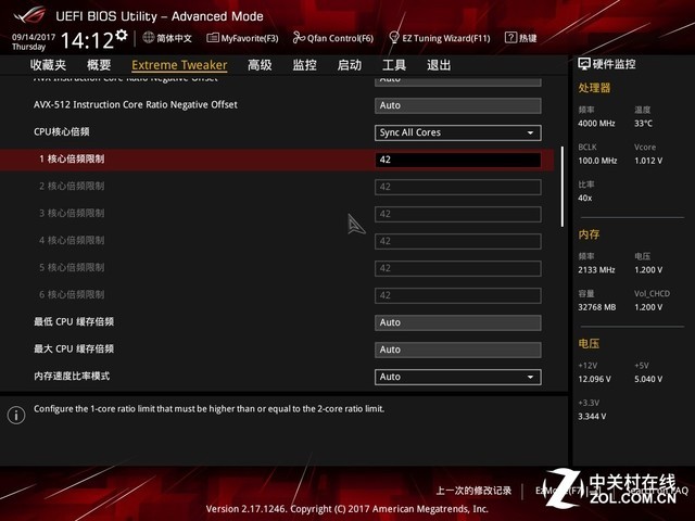 现在的新品处理器外频(上图的BCLK频率)基本上很难有太大动作,想要超频大都是直接调节倍频,将下方的“CPU核心倍频”选项从By Core Usage(根据负载调节)改为Sync All Cores(同步所有核心),然后就会出现下方的倍频设置,默认状态下是AUTO,可以根据经验来进行尝试,输入42,就代表CPU主频调节至了100*42=4200MHz=4.2GHz。当然要是想要极限超频还可以选择自主设置每个核心的频率。