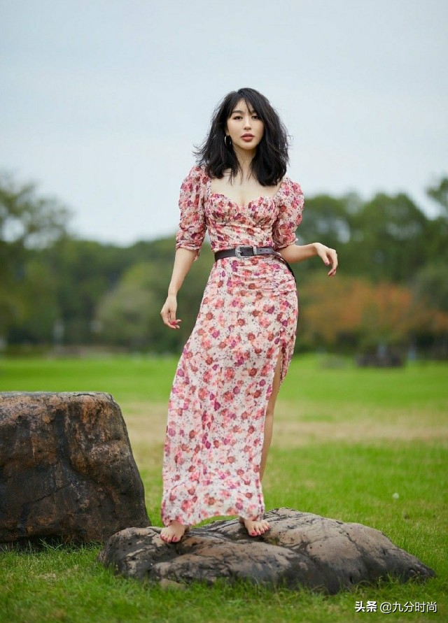 也可以选择能够重点强调自身优势部位的款式,例如腰部、臀部、腿部等。想走性感风的就选V领、一字领口;细腰丰臀的身材就选收腰、包臀款碎花裙;腿长、腿细的姐妹就选短款、不规则裙摆的碎花裙。
