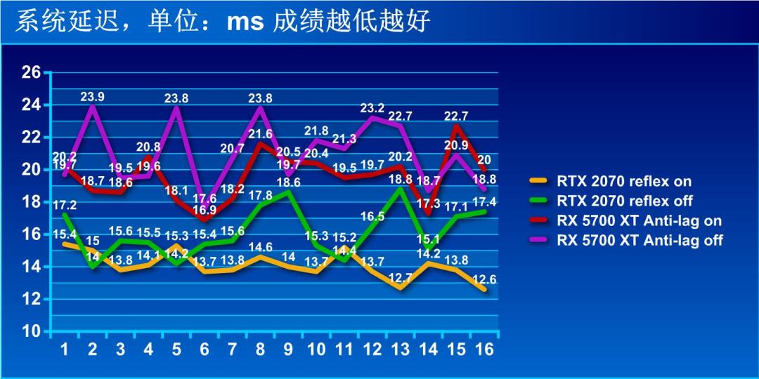 以上成绩是本次所有GPU在开启低延迟(NVIDIA Reflex、AMD Radeon Anti-lag)的系统延迟对比,成绩一共有16组。同样的,Reflex模式需要启动《彩虹六号:围攻》的Vulkan模式。而AMD的Anti-lag技术目前不支持Vulkan环境,只能在DX运行环境下进行测试。