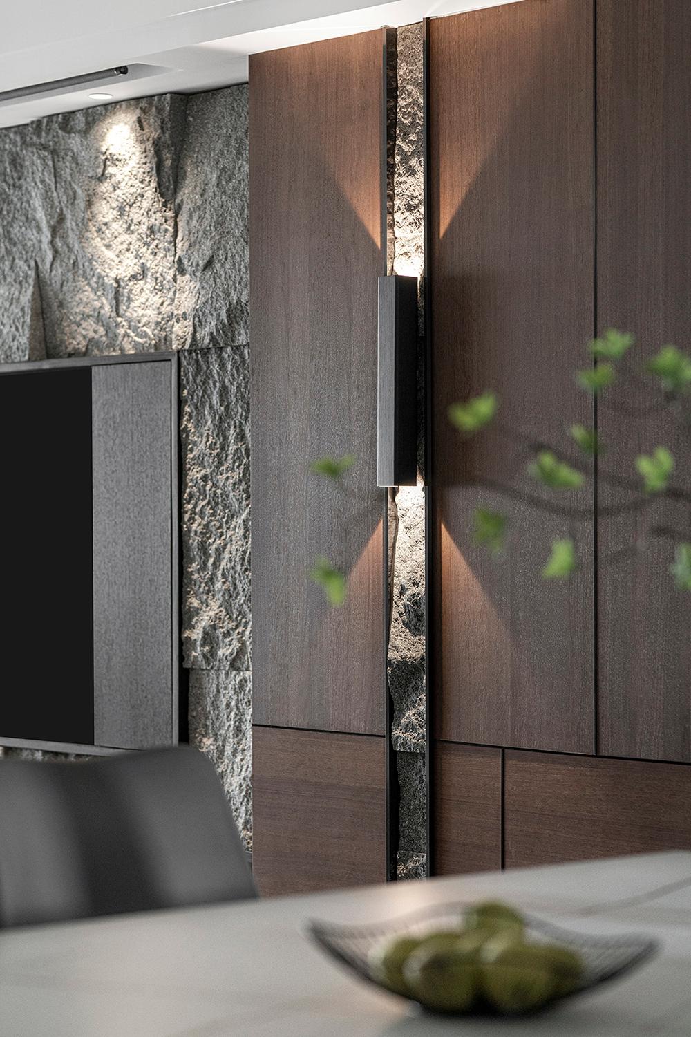 ▲凹凸不平的石材与表面平整的胡桃木,无论是色彩还是质感上都能给人强烈的视觉冲击感。