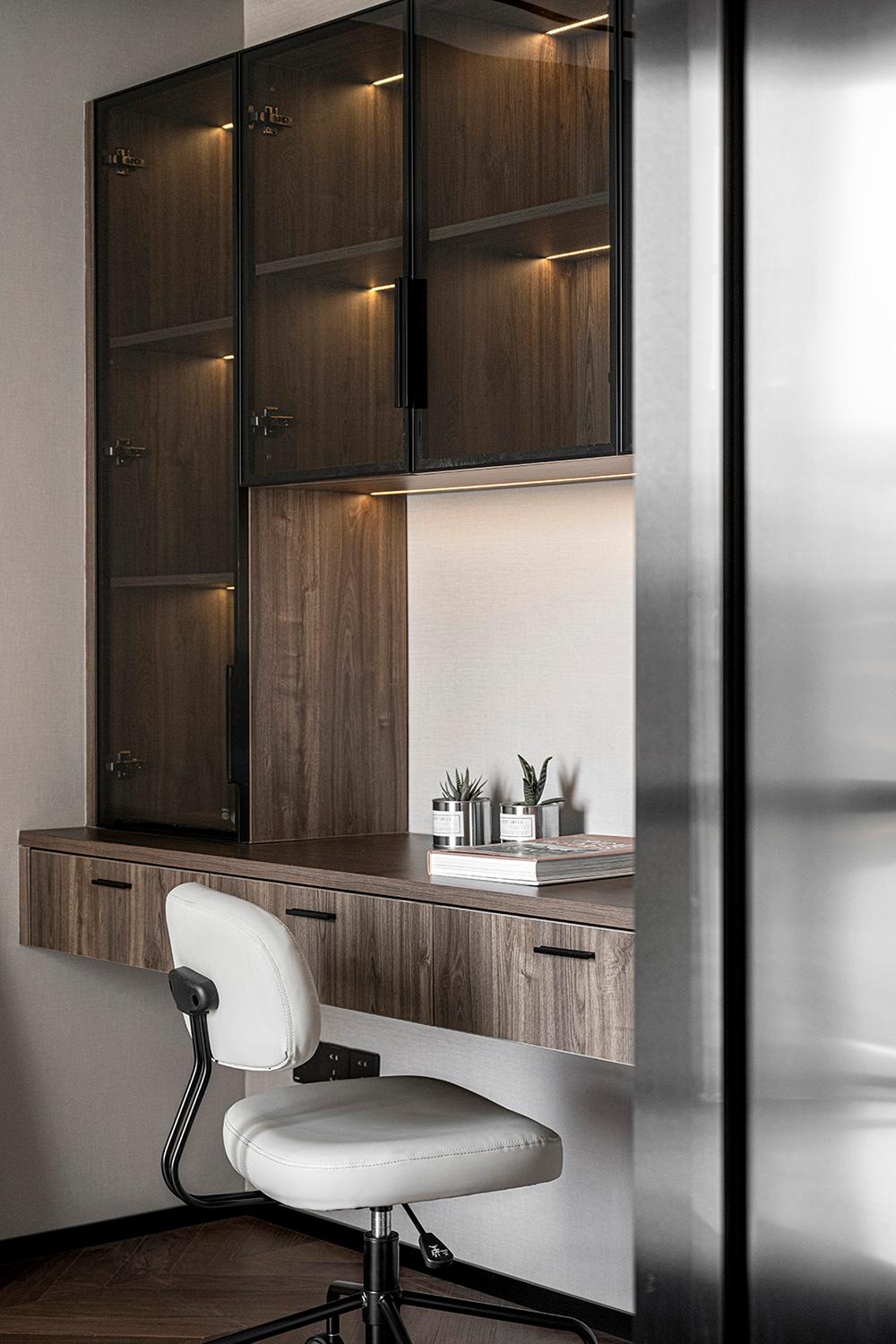 ▲电视墙的左侧设计了一个长虹玻璃推拉门,里面藏着的是一个书房,给家人办公提供了场所。
