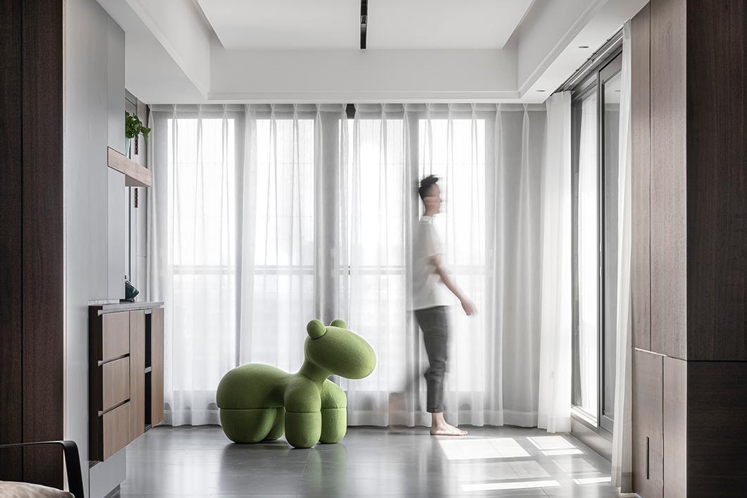 ▲朦胧的白纱,把阳光过滤后再照射到室内,显得那么的纯净,绿色的下马坐骑,点亮了空间,同时也方便家人穿拖鞋。