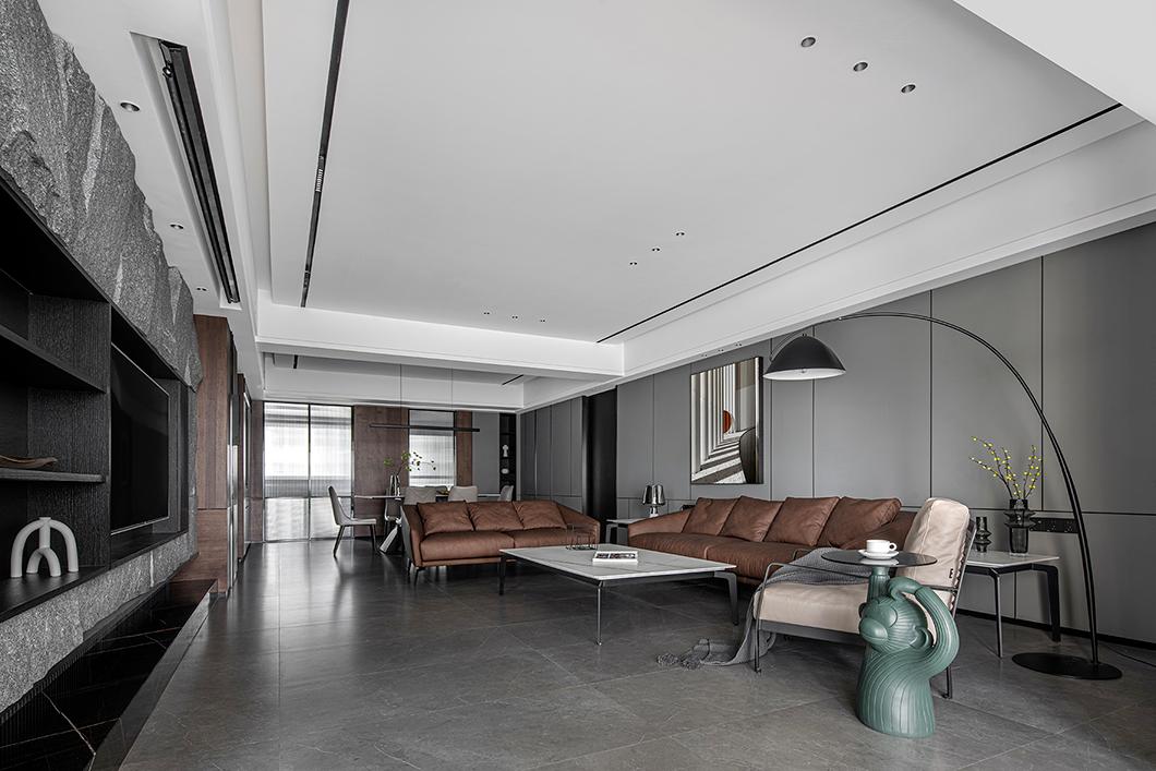 ▲客厅天花做大平顶+无主灯照明的方式,暗藏磁吸灯的加入,让客厅的线条感更强烈。