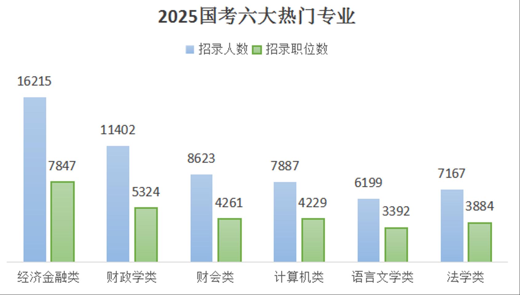 在专业限制方面,2025国考仅有25人、22个岗位不限专业,其余39696人、20788个职位设置了专业需求。中公教育统计数据显示,经济类、财政学、金融类、计算机类、财会类和法学类专业人才需求量最大,招录人数均上万。